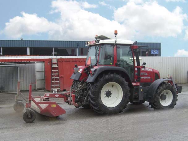 Veegmachine voor smalspoortrekker, geschikt voor reinigen van verhardingen en paden.